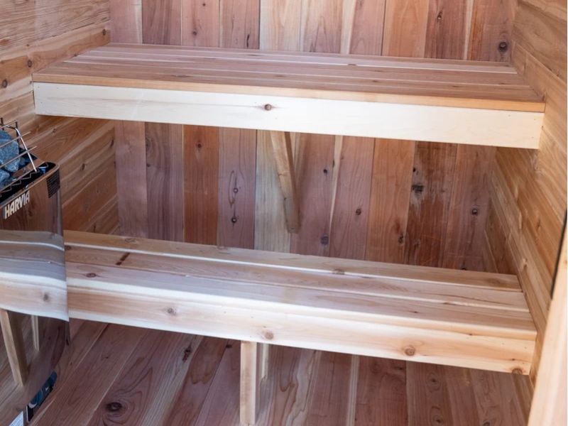 The upper bench sits in a hotter zone, ideal for those wanting a more intense session, while the lower bench stays cooler — offering flexibility.